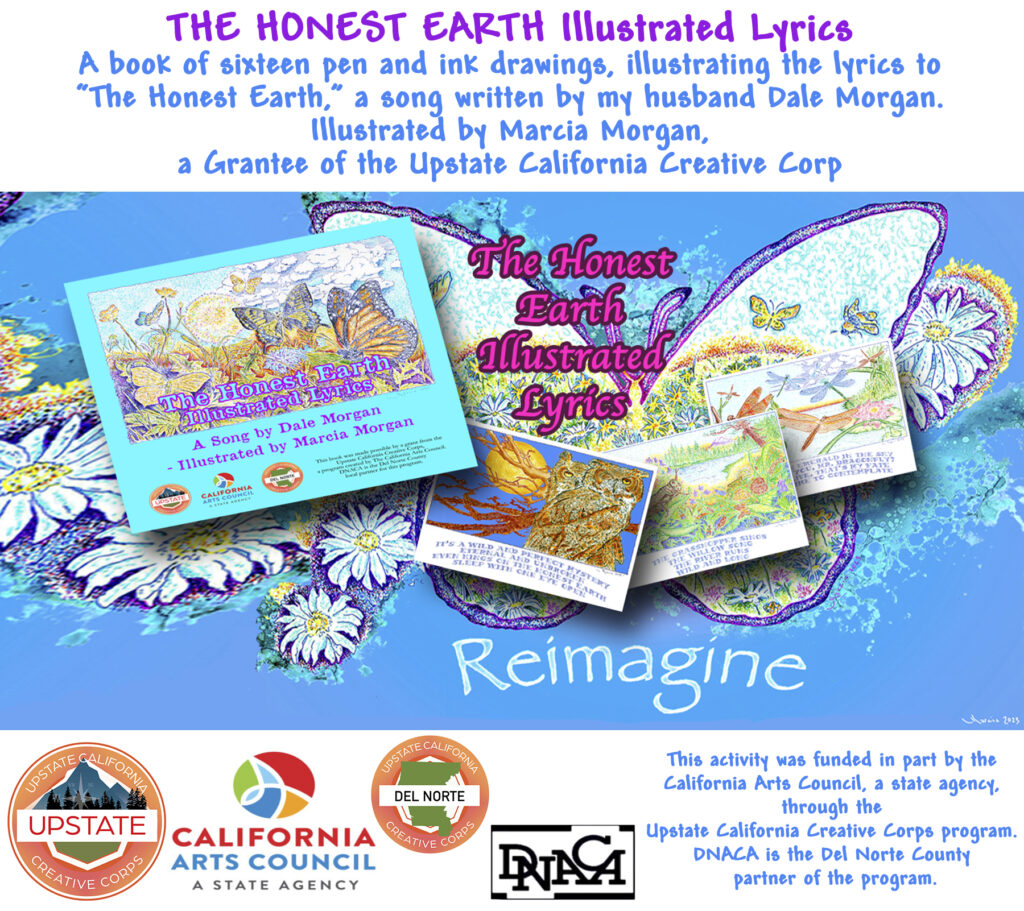 Sixteen pen and ink drawings, illustrating the lyrics to “The Honest Earth,” a song written by my husband Dale Morgan. The lyrics celebrate and focus on nature, the earth, and the wonderful creatures in it. $24, includes shipping.